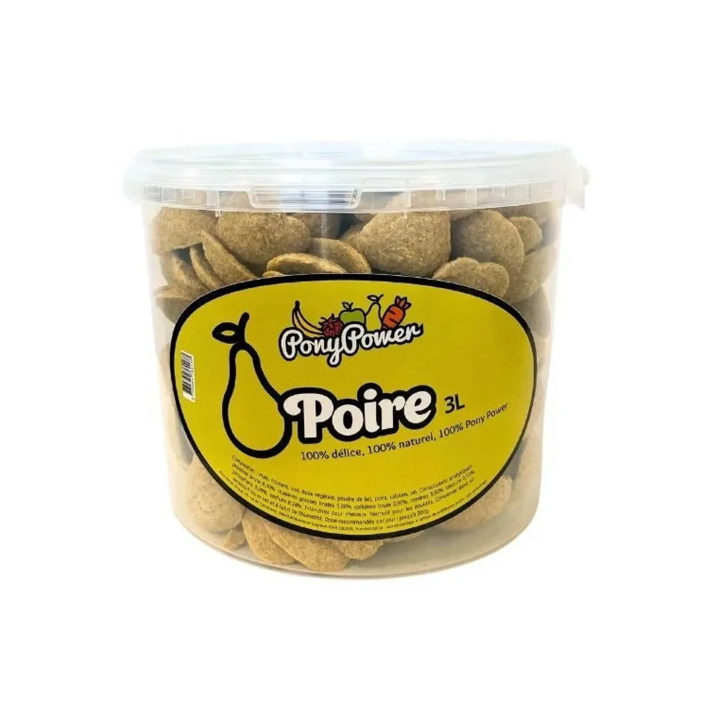 Friandises Poire de Pony Power – des friandises naturelles pour récompenser votre cheval. Format 3L, correspond à 1,5kg.