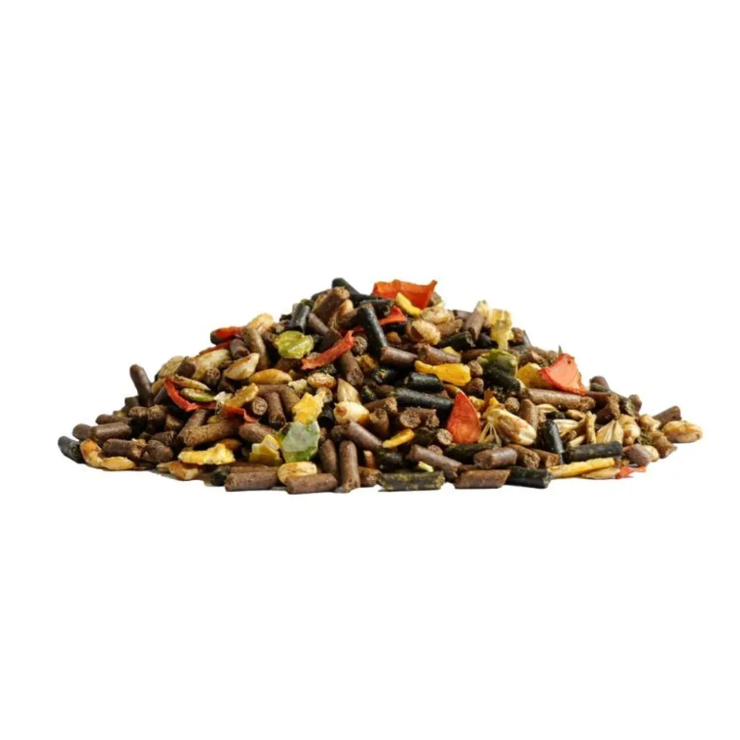 Son de blé, Luzerne déshydratée, Pulpe de chicorée, Flocons d’orge, Luzerne déshydratée en brins longs, Flocons de maïs, Huile de colza, Orge soufflée, Graines de lin cuites extrudées, Argiles, Mélasse de canne à sucre, Flocons de pois, Fructo-oligosaccharides, Sel, Phosphate bicalcique, Marc de pomme séché, Flocons de maïs et flocons d’orge fractionnés, Carottes séchées, Carbonate de calcium, Huile de lin, Germes de blé.
