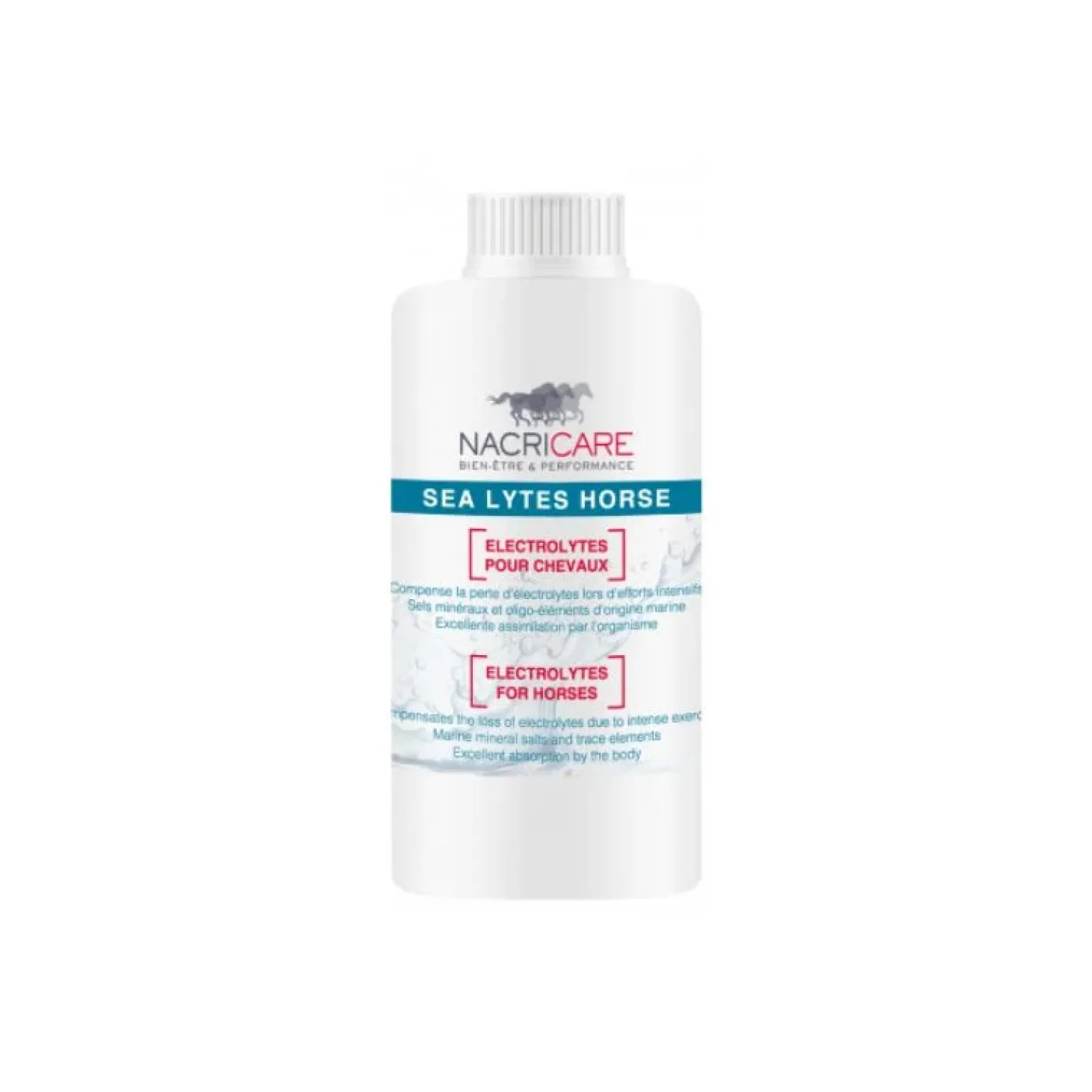 Sea Lytes de Nacricare est un complémentspécifique et hautement concentré pour compenser les pertes en sels minéraux et en oligo-éléments chez le cheval.