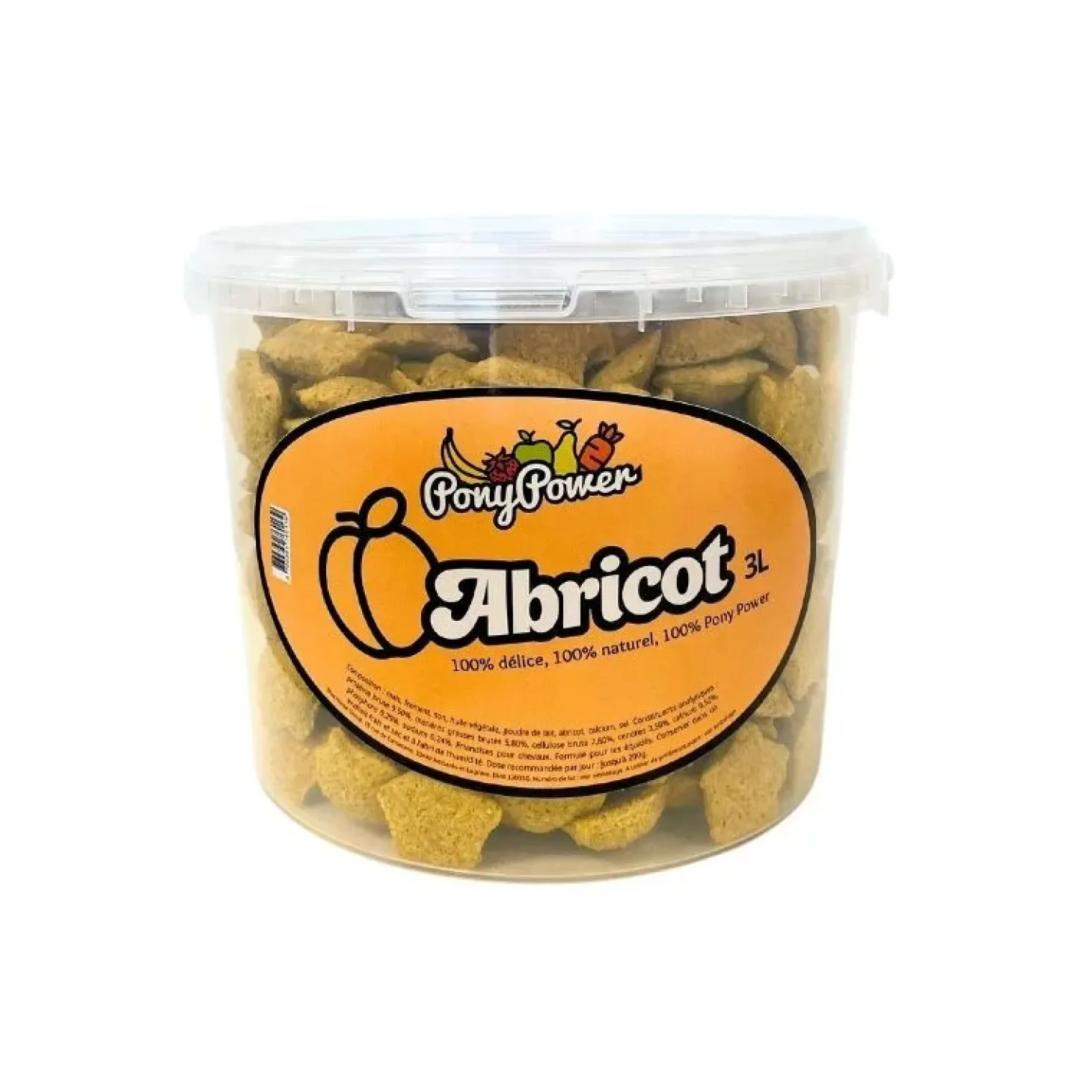 Friandises Abricot de Pony Power – des friandises naturelles pour récompenser votre cheval. Format 3L, correspond à 1,5kg.